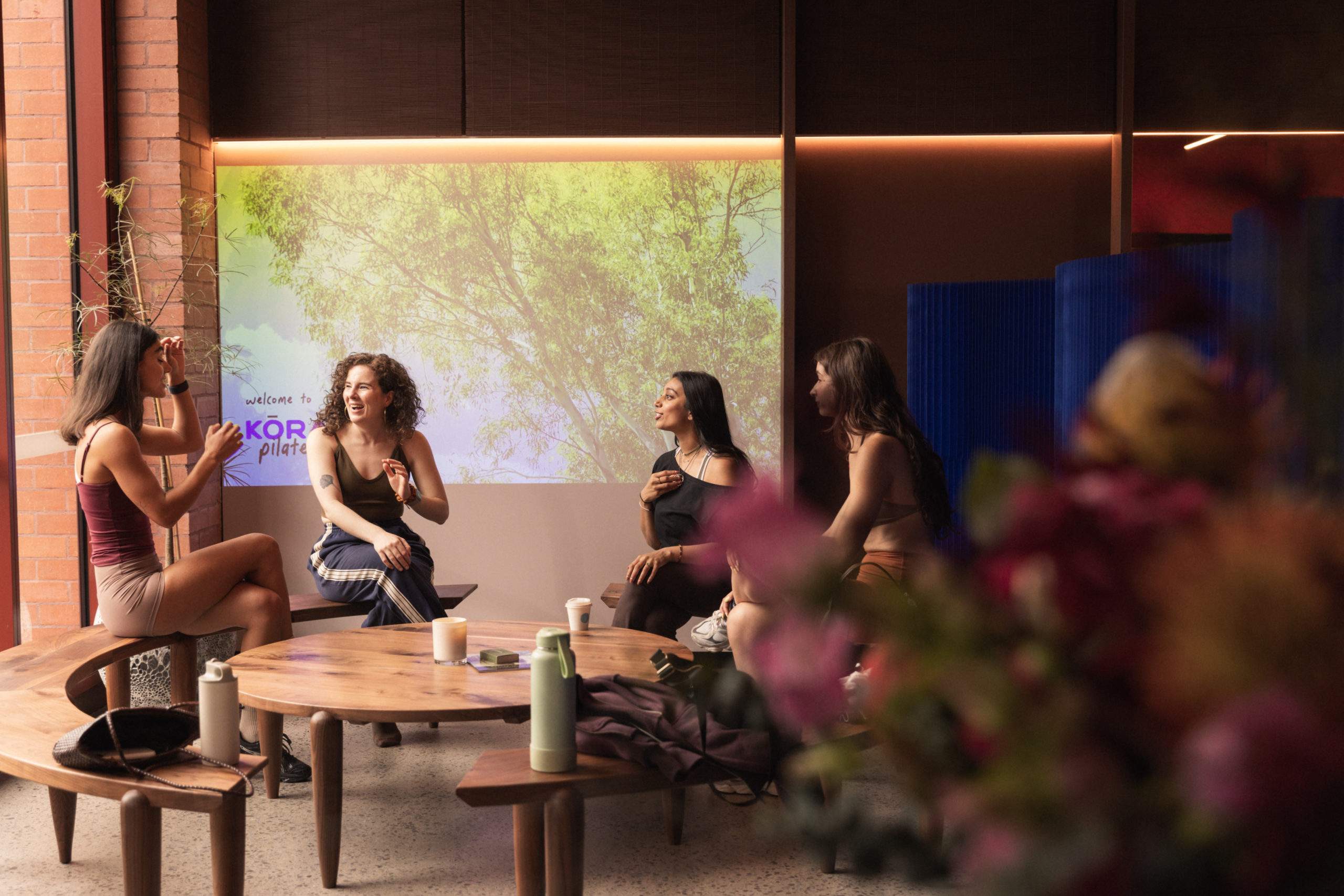 Decked out with a circular wooden bench, projector and bamboo blinds, the lounge area will soon host wellness workshops.