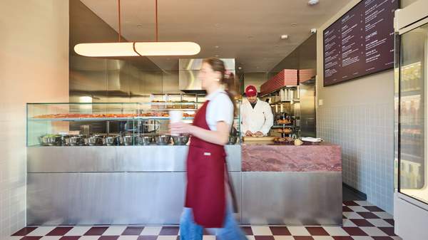 The design by Richard Hall & Son cleverly balances industrial edges with playful flourishes — deep red tones, Italian-inspired checkerboard tiling, eye-catching benches by Hay and Steelotto and a stainless steel counter with marble inset create a space that's casual enough for a quick coffee run, but considered enough to make waiting for your pizza a pleasure.