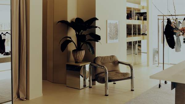The store feels like a peek into Scarlet and Sam's backrooms. Harriet Elliott of Studio Elliott kept things pared back yet chic: white shelves and racks, a wooden trestle-like table that serves as a counter, and curtain-lined walls that soften the vibe. Fun sculptural bits and Scarlet & Sam's pieces break up the monochrome. The team dubs it a "little sister store" that previews a more permanent space to come.