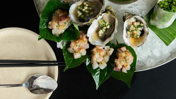 For $76, feast on a raw seafood platter crowded with Moreton Bay bugs, Pacific oysters, beef tartare, asparagus rice paper rolls, and the restaurant's signature betel leaf kingfish. Also included is cha ca baby snapper wrapped in banana leaf, with sides of red cabbage, pickled red onion and yum puk, plus your choice of vermicelli or rice.
