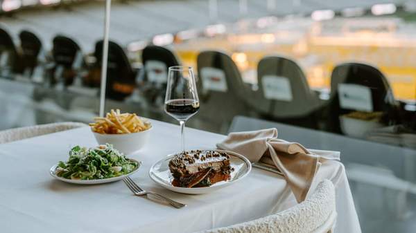 The smaller plates hit the mark too, with Stoke-Grill bringing match-winning dishes from Stokehouse to the stadium, including its iconic saltbush and vinegar potato cake; mixed crudo, tuna, kingfish, market fish with olive and marjoram dressing; and a spanner crab dog with lime and coconut. Before the siren sounds, dig into crowd-pleasing desserts like the Stokey date pudding, served with vanilla ice cream and butterscotch.