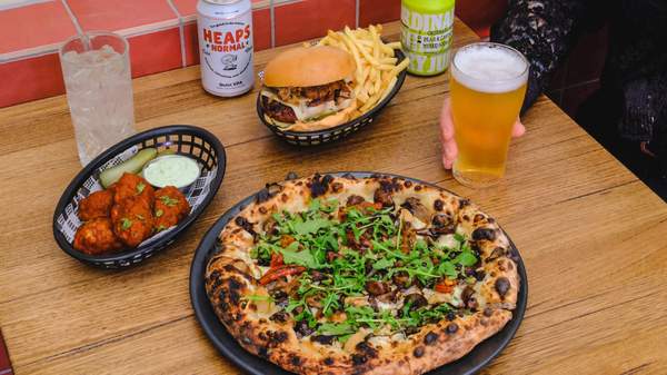 Pizzas range from traditional, such as pepperoni and Hawaiian (albeit with dairy-free cheese and meat-free meats), to the more adventurous. The cheeseburger pizza comes with dairy-free mozzarella, crumbled burger, red onion, pickles and special sauce. The patatas bravas sees a smoky tomato base topped with chorizo, potato, dairy-free parmesan and chipotle aioli. Or go for the Bánh Mì, which sees your fave sandwich toppings of char siu, hoisin, spring onion, chilli, coriander and peanuts, transported atop a crispy pizza base.