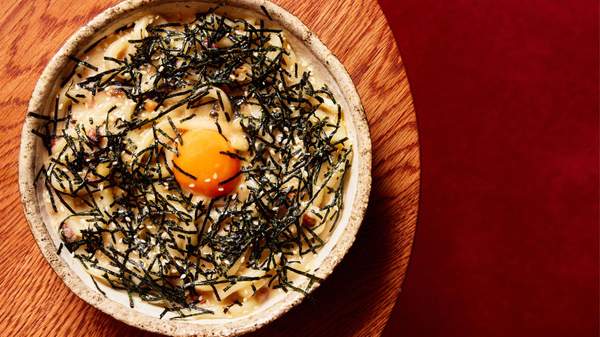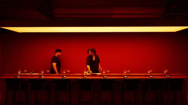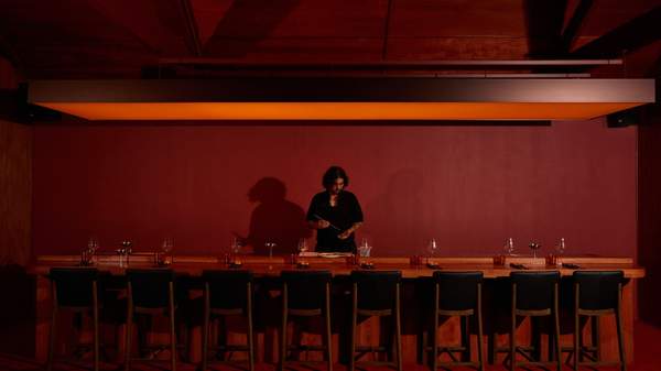 Explore further, and you'll find a lacquered, den-like dining room, designed by Thai Ho and Joan Budiono, and constructed by DIRECTITUDE. Taking cues from the moody and enticing late-night lounges of Tokyo, the low-lit space, enveloped in Japanese red timber with sultry cherry-red leather banquettes and bottle-green booths, lends itself to leisurely lunches and boozy dinners.