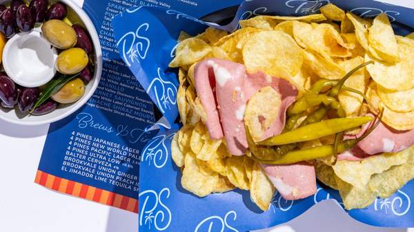 The menu is snacky and straightforward, think bread and dips, freshly shucked oysters, prawns with cocktail sauce, marinated olives and kingfish crudo. Sea salt crisps with mortadella and peppers, or charcuterie with pickles, are the perfect accompaniment to a round of Bondi Breezers with vodka, pineapple, lime, agave and soda.