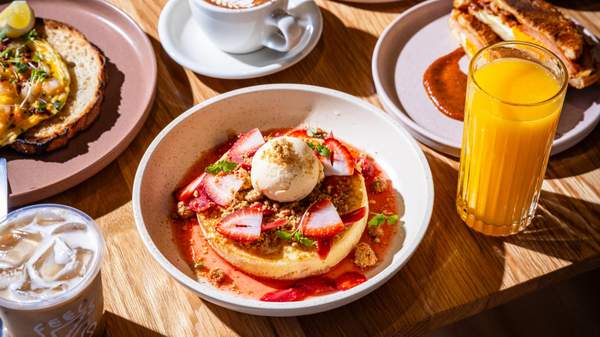 As for the menu, there's a steady hand in charge. Head Chef Daniel Grey brings years of experience from working in renowned kitchens like AALIA and The Apollo, offering fresh takes on brekkie and brunch staples. The ultimate bacon and egg roll is served as a pressed croissant, with fontina and Kasundi ketchup. Meanwhile, the hotcakes are stacked with roasted rhubarb and strawberry almond crumble, finished with strawberry syrup and house-made vanilla bean ice cream.